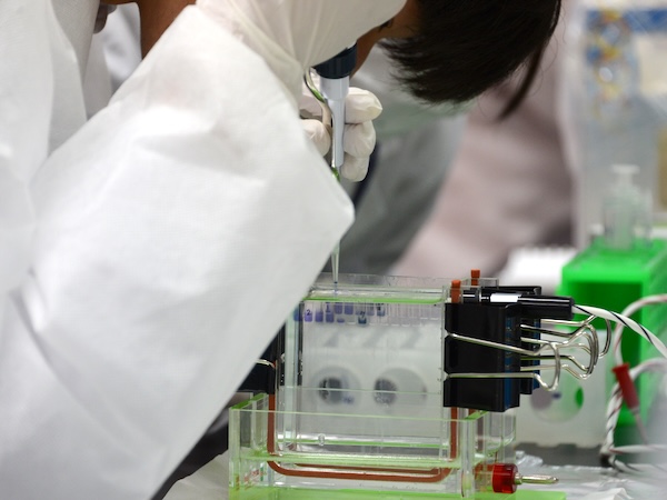 今回は親子 2組を含む中学 2年生から 60代まで 24名にご参加いただき、山梨・東京など遠方から泊まりがけで受講してくださった方もいました。中学校 6校・高等学校 7校から参加した生徒 14名・教員 2名と、学外の社会人 2名、本学の研究生(海外からの留学生)・大学院生・教職員 6名が 4人ずつ 6班に分かれて、大学院生の TA が 1名ずつ付き、医工学実習室(実験室)と医工学共同講義室を会場に 2日間の実習に取り組みました。